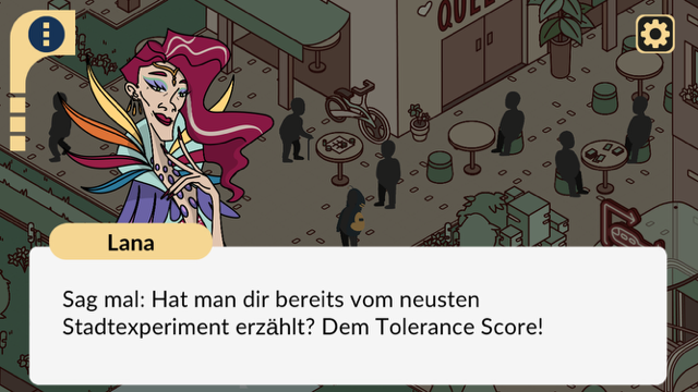 Herzlich willkommen in Ilios, der idealen Stadt der Zukunft im Als Neuankömmlinge erkunden Spielende die Stadt, schließen neue Bekanntschaften und lernen unterschiedliche politische Standpunkte der Bürger*innen von Ilios kennen. Dabei erfahren sie bald: Das wichtigste Instrument der Bürger*innen ist der „Tolerance Score“, der nach demokratischer Abstimmung eingeführt wurde und aktuell in der Pilotphase steckt. Dahinter verbirgt sich ein Punktesystem, das ihr Verhalten bewertet – wer besonders gemeinwohlorientierte Dinge tut, kann von anderen gelobt werden und so Toleranzpunkte sammeln, die für Gutscheine und kleine Vorteile eingetauscht werden können. Doch eines Tages wird eine zweite Phase des Experiments eingeführt, über die die Bürger*innen nicht abgestimmt haben. Von nun an ist es auch möglich, diejenigen zu melden, die sich nicht solidarisch verhalten, sodass sie dafür Punkte verlieren. Auf einmal dürfen Bürger*innen, die nicht genügend Punkte haben, die Brücke in einen anderen Teil der Stadt nicht mehr überqueren. Unmut macht sich breit, und schnell wächst der Widerstand. Welche Meinung vertreten die Spielenden – und wollen sie eine gemeinsame Lösung finden, die alle mit einbezieht? |
