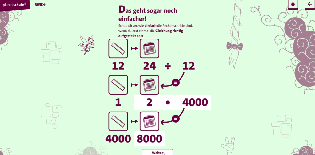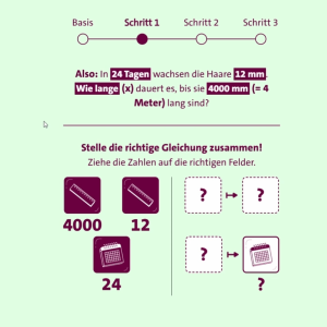 Um diese Problemstellung zu lösen, ziehen die Spielenden per Drag and Drop die passenden Variablen und Zahlenwerte auf ein vorgegebenes Lösungsraster. Dabei werden nur richtige Lösungen akzeptiert, um das Spiel voranzubringen. Wer falsch liegt, muss es nochmal probieren. Nachdem die Aufgabe gelöst wurde, wird der gesamte Lösungsweg erneut und am Stück präsentiert und die Rechenschritte einzeln visualisiert. In jedem Märchen gibt es zudem zwei weitere Aufgaben. Die Schwierigkeit wird dabei erhöht, indem es keine symbolischen Darstellungen der Variablen mehr gibt, sondern nur die richtige Gleichung aufgestellt und die passenden Zahlenwerte zugeordnet werden müssen.