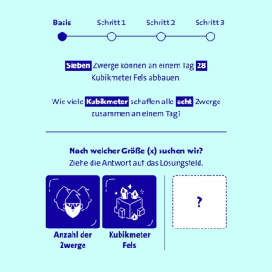 Damit die Lernenden die Gleichungen nicht nur durch bloßes Ausprobieren lösen, ist es beim Einsatz im Unterricht sinnvoll, begleitende Impulse für das Verständnis des Dreisatzes einzubinden und die systematischen Zusammenhänge des Phänomens gemeinsam zu erarbeiten. Wenn klassischerweise sieben Zwerge in der Mine schuften. Was bedeutet es wirklich, wenn ein achter Zwerg mitarbeitet? Welche Auswirkungen hat dies auf die Arbeitszeit oder Produktivität der Gruppe, wenn jeder Zwerg weiterhin dieselbe Menge Erz pro Stunde schürft?