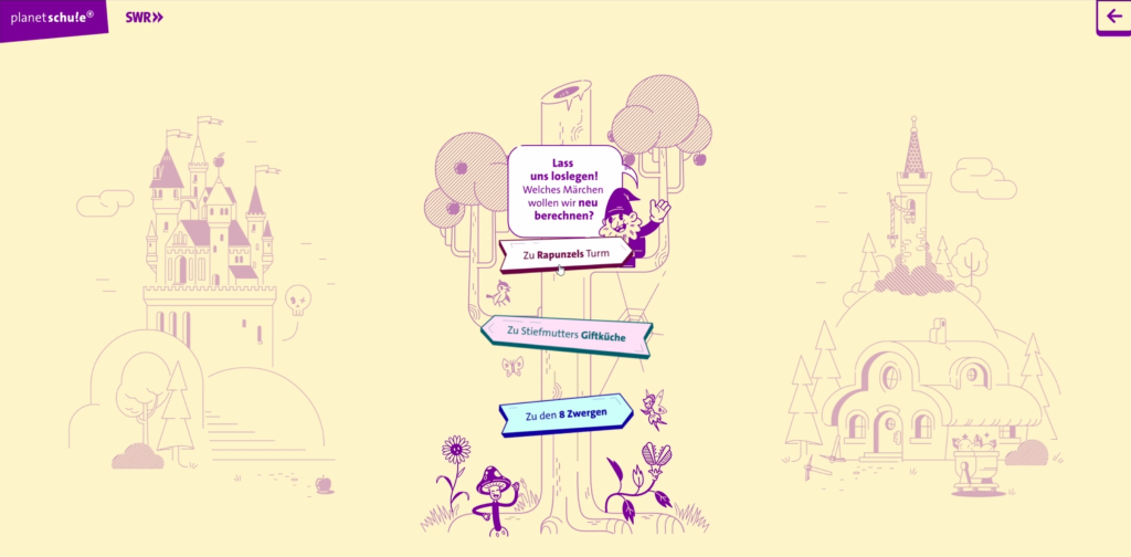 Der Dreisatztrainer ist ein Mathelernspiel, welches sich für den Einsatz ab der sechsten Klasse eignet. Übungsaufgaben werden mit humorvollen Variationen bekannter Märchen narrativ gestaltet.