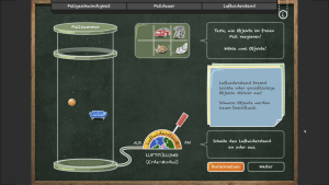 Anhand kleiner Simulationsumgebungen im jeweiligen Level können die Spielenden auch selbst handlungsorientiert herausfinden, wie sich Objekte in bestimmten Situationen verhalten und so ihre eigenen Konzepte auf die Probe stellen. Im virtuellen Vakuumsexperiment können sie etwa untersuchen, wie die Fallgeschwindigkeit verschiedener Objekte wie eines Autos und eines Basketballs durch den Luftwiderstand beeinflusst wird. Im All können sie die Beschleunigung der Raumstation ISS variieren und dadurch erfahren, wie sich ihre Umlaufbahn durch die Wechselwirkung von Beschleunigung und Erdgravitation verändert. Und im Sprungtest sehen sie, wie die unterschiedliche Schwerkraft auf einzelnen Planeten unseres Sonnensystems sich auf die Sprunghöhe eines Menschen auswirken würde. Diese Experimente können im Unterricht gemeinsam besprochen und reflektiert werden, indem die Lehrkraft die Darstellungen im Spiel mit Bezug zu zusätzlichen wissenschaftlichen Quellen kontextualisiert.