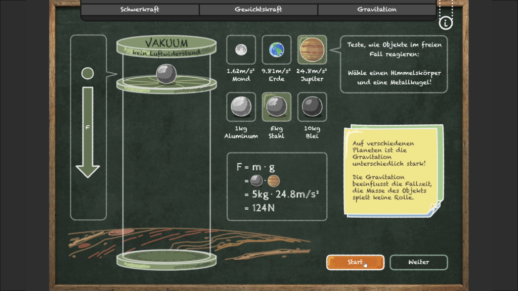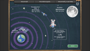 Wer hier innerlich zustimmend mit dem Kopf nickt, sitzt jedoch einer verbreiteten Fehlvorstellung auf: Die Gesetze der Physik hören nicht an der Grenze der Erdatmosphäre einfach auf zu wirken, sondern werden nur schwächer oder werden durch andere abgelöst. Das Serious Game Gravitas nähert sich verschiedenen physikalischen Fehlkonzepten, die in Unterrichtseinheiten rund um Gravitations- und Beschleunigungskräfte häufig auftreten. Durch kleine Simulationen macht es die jeweils ausschlaggebenden physikalischen Prinzipien und Regeln anschaulich begreifbar und zeigt dynamisch auf, wie sich Fallgeschwindigkeiten, Umlaufbahnen und Kräfte durch Veränderung verschiedener Parameter entsprechend physikalischer Gesetzte verändern.