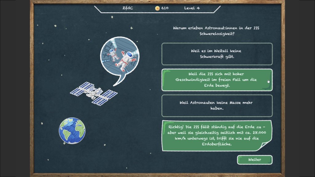In rund 20-30 Minuten durchlaufen die Spielenden sechs Level, die jeweils ein physikalisches Fehlkonzept behandeln. An ihr Vorwissen aus dem Unterricht oder aus dem Alltag anknüpfend erarbeiten sie sich nach und nach anhand anschaulicher Beispiele aus der Raumfahrt und Experimentalphysik Gravitationskräfte, Gesetze der Impulserhaltung und der Geschwindigkeiten, die dann im Unterricht aufgegriffen und gefestigt werden können. Dazu kommen Quizfragen zum Einsatz, bei denen z. B. ausgewählt werden muss, wie sich ein im luftleeren Raum losgelassenes Objekt verhalten wird oder warum Astronat*innen auf der Raumstation ISS das Erlebnis der Schwerelosigkeit haben. Nach der Auflösung erhalten sie zu jeder Frage eine kurze Erklärung, die ihr richtiges bzw. falsches Konzept einordnet. Adaptiv geht diese Rückmeldung dabei darauf ein, welche Art von Fehlkonzept durch die Antwort der Lernenden ausgedrückt wird.