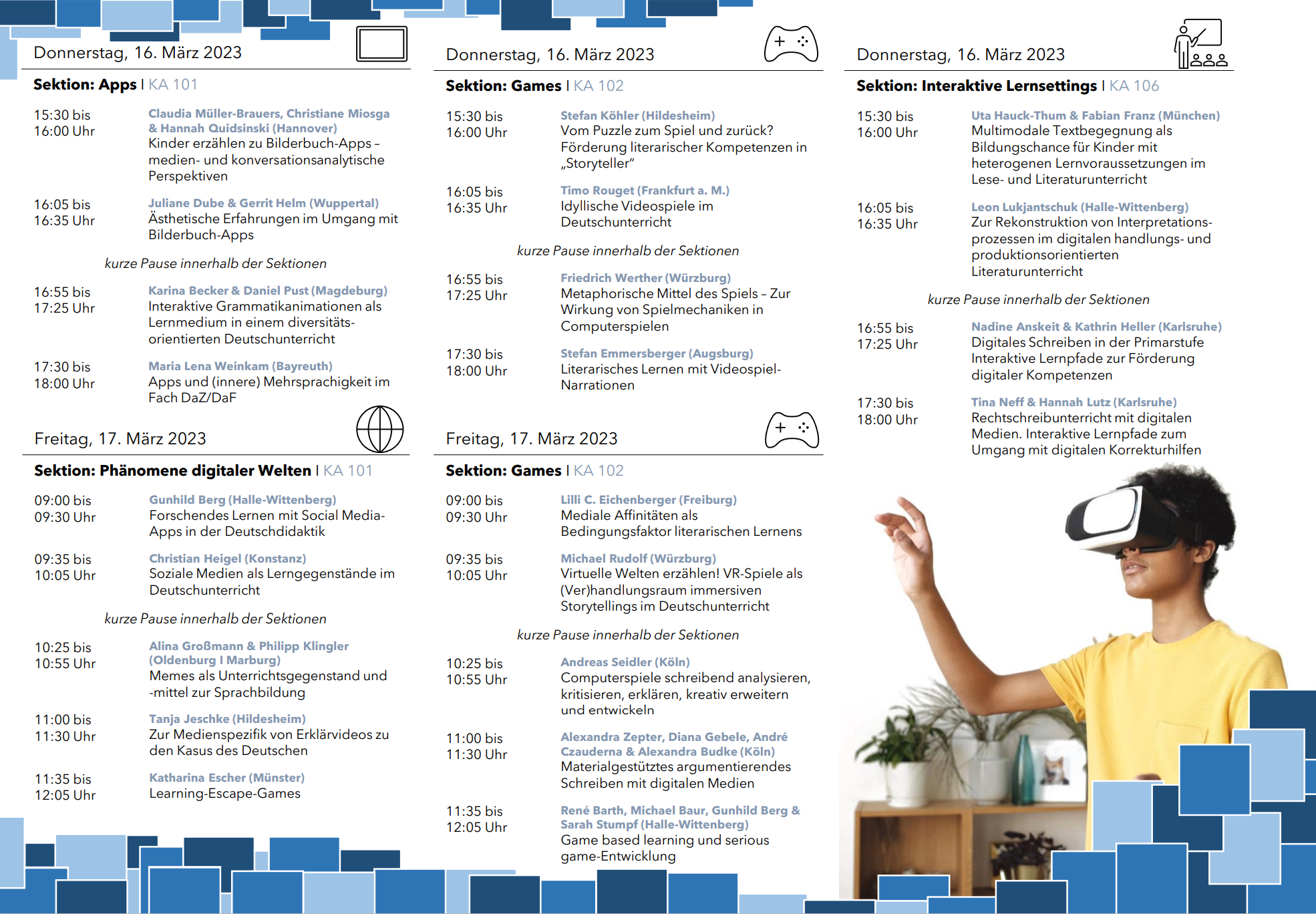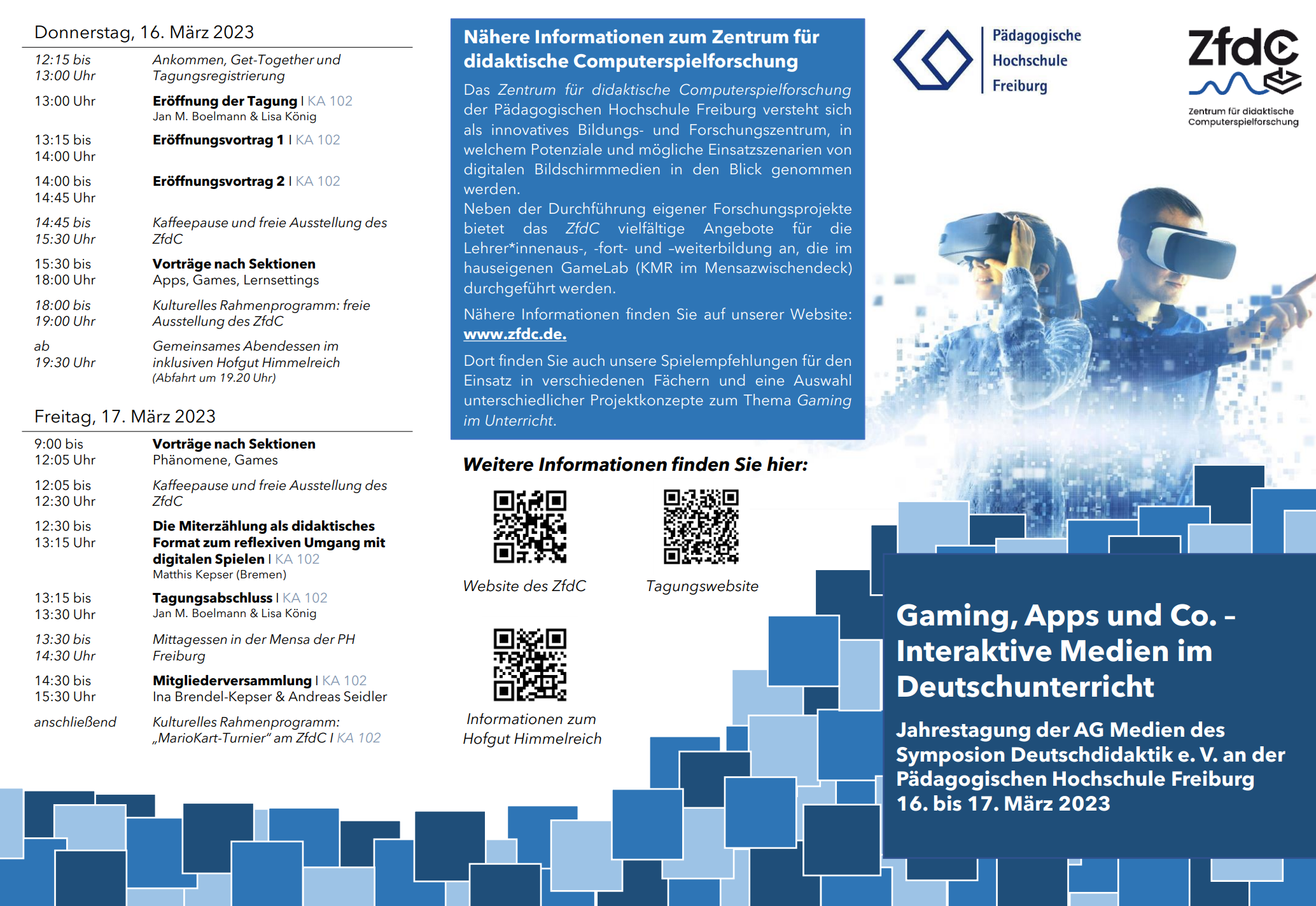 Gaming, Apps und Co. – Interaktive Medien im Deutschunterricht. Die kommende Jahrestagung der AG Medien des Symposion Deutschdidaktik findet im kommenden Jahr (16. bis 17. März 2023) an der Pädagogischen Hochschule Freiburg in Kooperation mit dem Zentrum für didaktische Computerspielforschung statt. Auf dieser Seite informieren wir Sie fortlaufend über den Planungsstand, das Tagungsthema und den Ablauf. Nähere Informationen zur AG finden Sie hier.